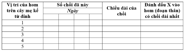 - Theo dõi và ghi lại sự nảy chồi của các cây mới từ các đoạn thân vào bảng: