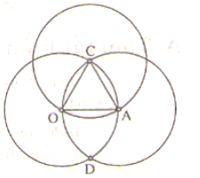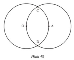 Trong hình 48, ta có hai đường tròn (O;2cm) và (A;2cm) cắt nhau tại C, D. Điểm A nằm trên đường tròn tâm O.