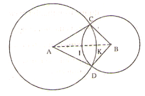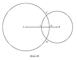 Trên hình 49, ta có hai đường tròn A;3cm) và (B;2cm) cắt nhau tại C, D. AB = 4cm. Đường tròn tâm A,B lần lượt cắt đoạn thẳn AB tại K, I.