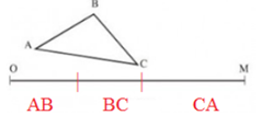 - Kiểm tra (bằng thước đo hay compa): Trên tia OM kể từ O ta đặt liên tiếp ba đoạn thẳng có độ dài lần lượt bằng AB, BC, CA. Ta thấy điểm cuối trùng với M.