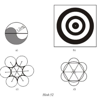 c) Trước hết vẽ đường tròn ở chính giữa có bán kình R. Vẽ một đường tròn phụ trùng với tâm đường tròn vừa vẽ, bán kính 2R. Trên đường tròn phụ, vẽ liên tiếp 6 dây, mỗi dây có độ dài 2R .Sau đó vẽ sáu đường tròn có tâm là mút của mỗi dây.