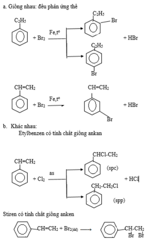 So sánh tính chất hóa học của etylbenzen với stiren, viết phương trình hóa học của các phản ứng để minh họa.