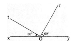Gọi Ot, Ot' là hai tia nằm trên cùng một nửa mặt phẳng bờ là đường thẳng xy đi qua O. Biết \[\widehat{xOt}\]= 300, \[\widehat{yO{t}'}\] = 600. Tính số đo các góc \[\widehat{yOt},\text{ }\widehat{tOt'}\].