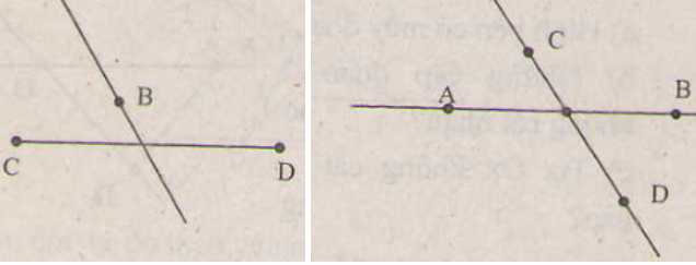 b) Đường thẳng AB cắt đoạn thẳng CD đồng thời đường thẳng CD cắt đoạn thẳng AB.