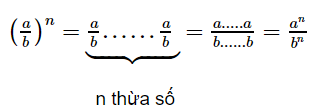 b) Với n là một số nguyên dương, ta gọi tích của n thừa số \[\frac{a}{b}\] là lũy thừa bậc n của \[\frac{a}{b}\] và kí hiệu là \[{{\left( \frac{a}{b} \right)}^{n}}\]