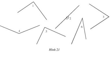 Bài 14 (trang 79 SGK Toán 6 tập 2): Xem hình 21. Ước lượng bằng mắt xem góc nào vuông, nhọn tù, bẹt.